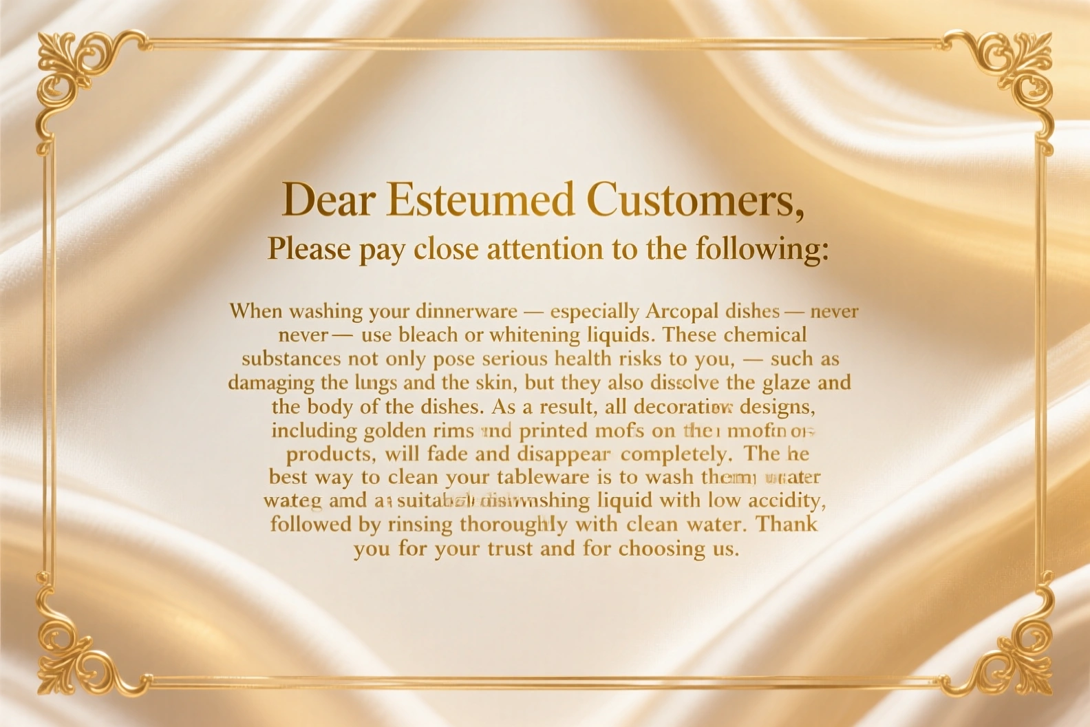 متاسفانه این کالا در حال حاضر موجود نیست. میتوانید از طریق لیست بالای صفحه، از محصولات مشابه این کالا دیدن نمایید.مشتریان گرامی لطفا به این موضوع دقت فرمایید :برای شستن ظروف غذاخوری مخصوصا ارکوپال ها به هیچ عنوان از وایتکس استفاده نکنید این مواد شیمیایی به غیر از زیان بسیاری که برای خود فرد دارد اعم از تخریب ریه ها پوست دست ها و ... لعاب و بدنه ظروف را در خود حل کرده و تمام طرح های روی محصولات از جمله لبه های طلایی و نقش های روی ظروف را از بین میبرد.بهترین روش پاک کردن ظروف شستن با اب و مایع ظرفشویی مناسب است (اسیدیته کمتر ) و سپس ابکشی فراوان ظروف ممنون از حسن انتخابتان
