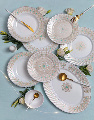 شامل : 1 عدد دیس، 1 عدد کاسه سالاد، 6 عدد بشقاب تخت ، 6 عدد بشقاب گود ، 6 عدد پیش دستی ،6 عدد کاسه ماست خوری،2 عدد نمک پاش